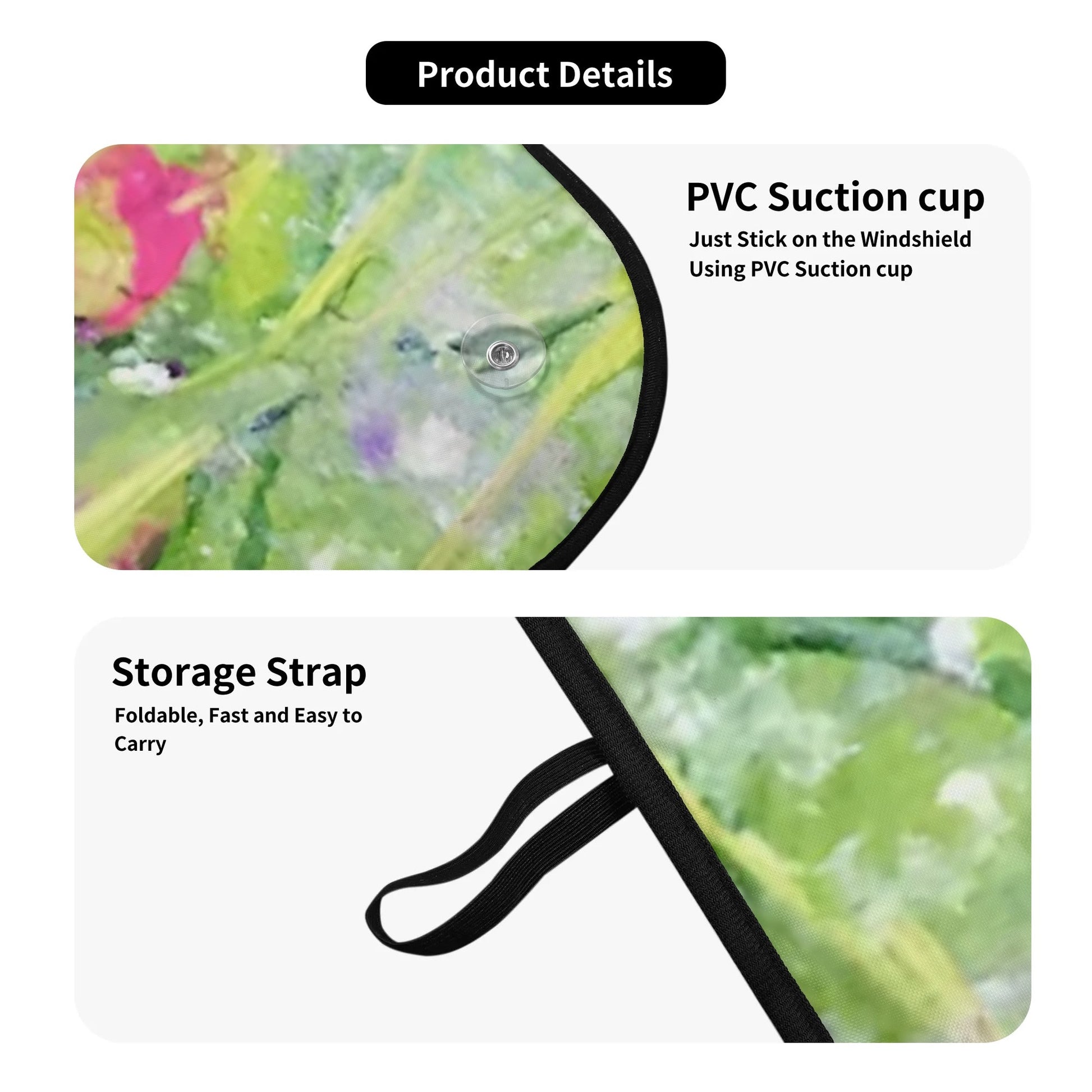 * The foldable car shade is equipped with durable PVC suction cups that firmly adhere to the windshield so it is easy to install whenever needed.